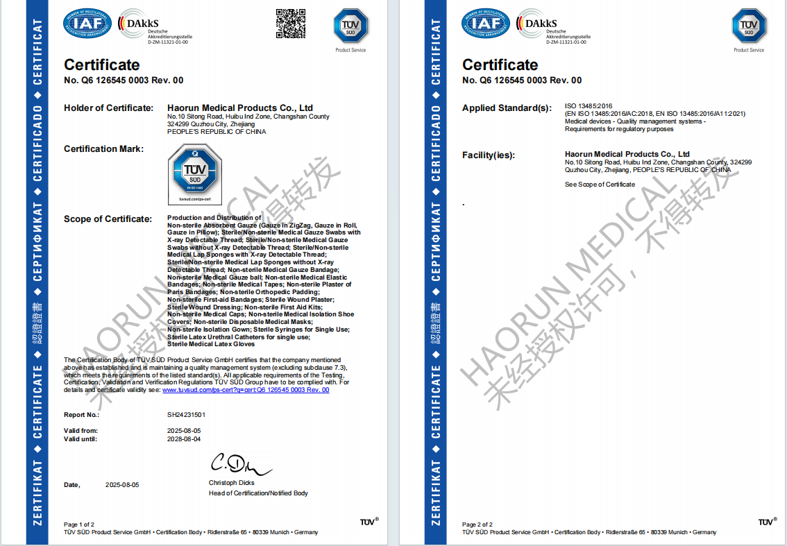 Kvaliteedi edasiseks suurendamiseks lõpetasime oma kvaliteetsete käsiraamatu ja protseduuri dokumentide avaldamise 2023. aasta septembris. Selle põhjal täiustasime oma kvaliteedijuhtimissüsteemi dokumente jaanuaris 2024, lisades MDR-iga seotud sisu. Möödusime TUV SUD auditi esimesest etapist 10. aprillil 2025 ja seejärel teisel etapil. Lõpuks sai selle aasta augustis meie sertifikaatide number kättesaadavaks teavitatud keha süsteemis vaatamiseks, tähistades uut sammu edasi Haorun Medical'i kvaliteedijuhtimissüsteemis ja tugevdades ettevõtte arengufondi. Meie ühekordselt kasutatavad meditsiinitarbed (gauze, marlirullid, marlisidemed jne) pakuvad klientidele kogu maailmas suurepärase toote kvaliteedi ja teenuse.